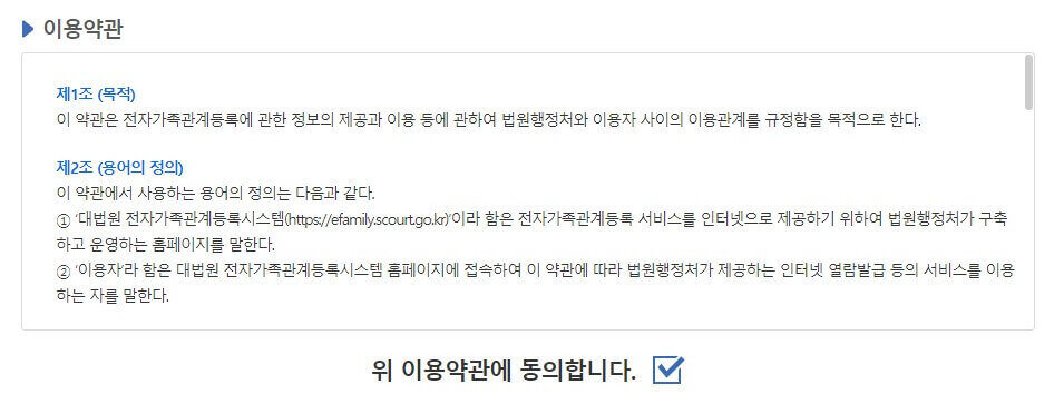 대법원 전자가족관계등록시스템을 이용하기 위해서는 이용약관에 대한 동의를 해주셔야 합니다. 동의를 하지 않으면 이용할 수 없으니 이용약관 동의에 체크합니다.