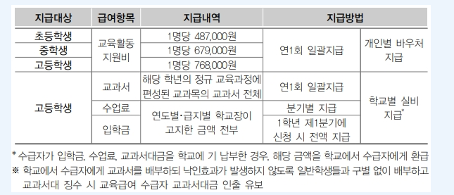 지원 내용은 학년별로 차등 지급되며, 교육활동지원비 형태로 지급됩니다. 고등학생의 경우 교과서비 및 입학금·수업료 지원이 포함될 수 있습니다.