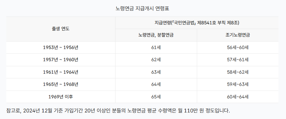 국민연금은 출생연도에 따라 수령 개시 연령이 다릅니다. 점진적으로 수령 나이가 상향 조정되고 있습니다.
