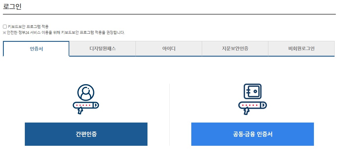 회원 신청하기를 누르면 로그인 화면으로 이동하게 됩니다. 인증서 로그인은 간편 인증, 공동/금융 인증서 로그인 방법이 있습니다. 두 가지 중 여러분이 지참하고 있는 인증서를 선택을 하여 로그인해주시면 됩니다.