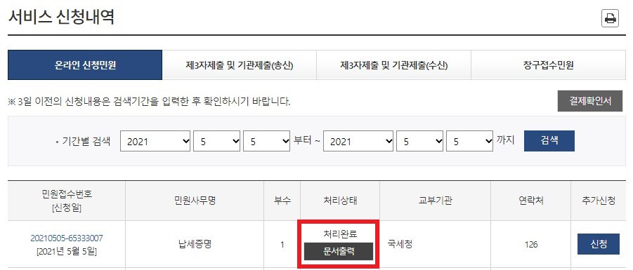 민원신청하기를 누르면 서비스 신청내역 화면이 표시됩니다. 이 페이지에서 문서출력을 선택해 주시면 됩니다.