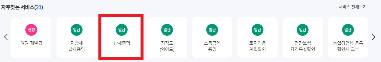 정부 24 홈페이지에 들어오셨다면 자주 찾는 서비스에서 서비스 전체 보기를 선택하여 납세증명을 찾아 선택을 해주셔야 합니다.