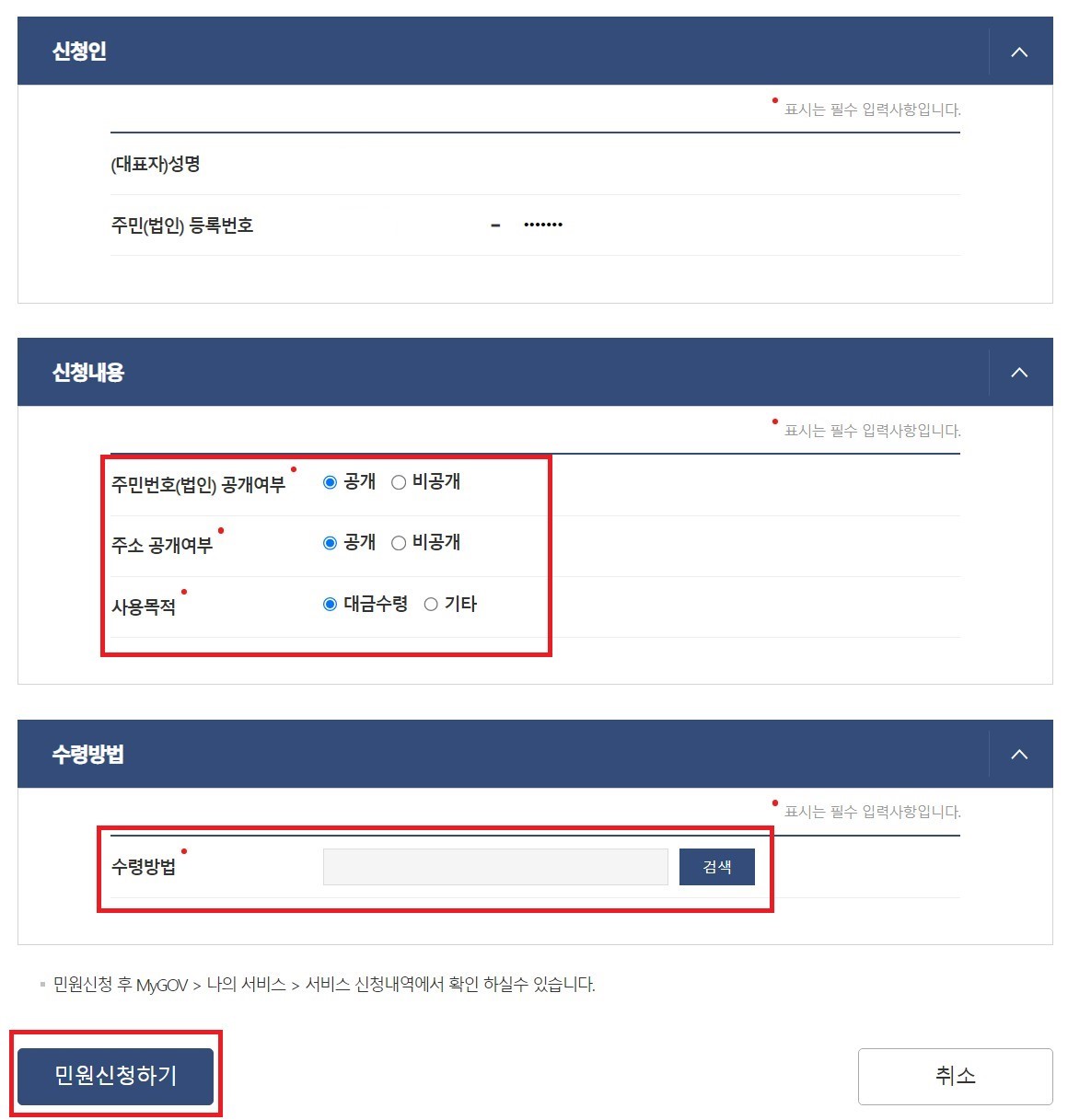 또한 주소 공개여부, 사용목적을 선택합니다. 다음으로 민원신청하기를 눌러주시기 바랍니다.