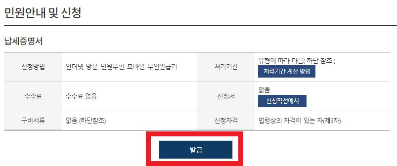 납세증명을 누르면 민원안내와 함께 신청방법 수수료 등의 정보를 확인할 수 있습니다. 국세완납증명서 인터넷발급 수수료는 무료입니다. 여기에서 발급을 눌러주세요.