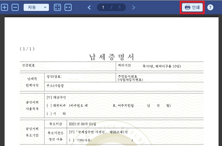 문서출력을 누르면 국세완납증명서 납세자 정보를 확인할 수 있습니다. 이 페이지에서 상단 오른쪽 인쇄 버튼을 누르면 프린터에 연결된 모델을 누르면 국세완납증명서 인터넷발급이 가능하고 pdf로 저장을 누르면 pdf파일로 저장이 가능합니다.
