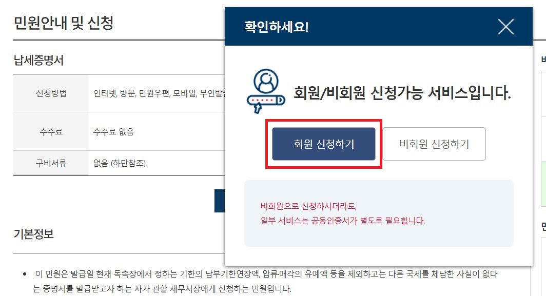 민원안내 및 신청화면에서 발급을 누르게 되면 회원신청, 비회원 신청하기 창이 뜨게 됩니다. 국세완납증명서 인터넷발급은 회원, 비회원 모두 신청이 가능하다고 하니 회원일 경우 회원 신청하기를 누르고 회원이 아닌 경우 비회원 신청하기를 누르셔도 됩니다.