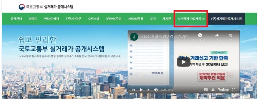 국토부 홈페이지의 상단 메뉴에서 "실거래가 자료제공"을 선택하면 실거래가 자료를 다운로드할 수 있습니다. 이를 통해 다양한 실거래가 데이터를 활용할 수 있습니다.