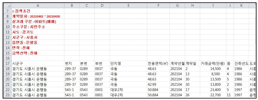 국토부 아파트 실거래가 조회 서비스에서는 원하는 조건을 선택하여 검색하고, 조건에 맞는 계약일자, 실거래가구분, 주소, 면적, 금액 등의 정보를 작성한 후 다운로드 버튼을 클릭하면 엑셀 파일 형식으로 자료를 받아볼 수 있습니다.