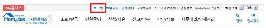 국세청 홈택스에 접속하셨다면 카테고리 상단에서 로그인을 클릭합니다.