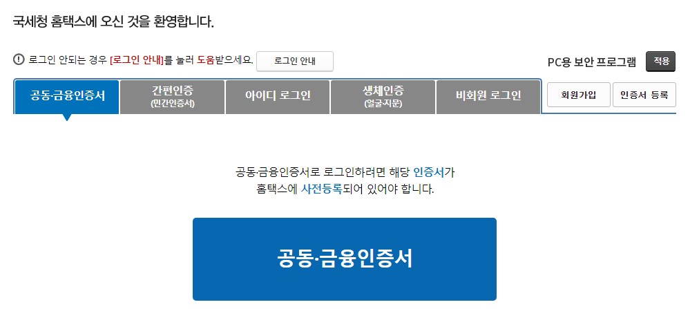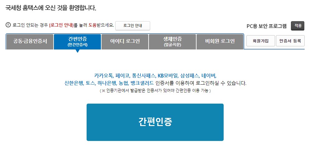 로그인 방법은 여러 가지 방법 중 대표적인 방법인 공동/금융인증서와 간편인증 방법이 있습니다. 여러분이 가지고 있는 인증서를 선택하여 로그인해 주시기 바랍니다. 인증서가 없다면 아래를 참고해 주시기 바랍니다.