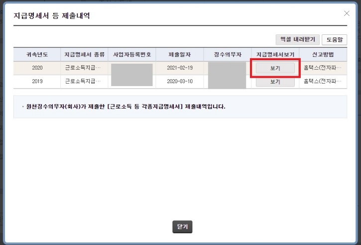 다음은 지급명세서 등 제출내역 화면이 표시됩니다. 여기에는 여러분이 직장을 다니던 회사에서 근로소득을 지급했던 내역이 연도별로 기입되어 있습니다. 여기서 여러분이 필요한 년도의 지급면세서 보기를 클릭합니다.