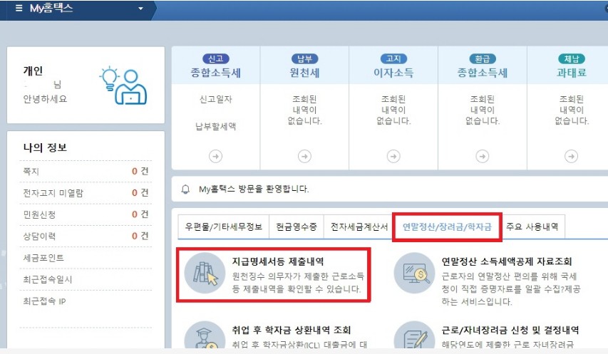 MY홈택스에 들어셔서 연말정산/장려금/학자금을 선택하고 지급명세서등 제출내역을 클릭합니다.