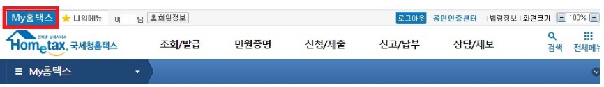 본인인증을 완료하고 로그인을 하셨다면 외쪽 상단에 있는 MY홈택스를 클릭합니다.