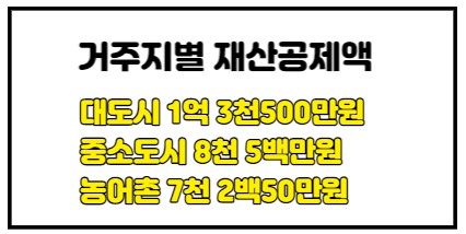 기초연금 소득인정액을 산정할 때 거주지별 재산공제를 해주고 있는데요. 대도시 1억 3천500만원, 중소도시 8천 5백만원, 농어촌 7천 2백50만원을 공제해 주고 있습니다.
