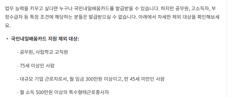 내일배움카드는 대부분의 국민이 신청 가능하지만 일부 제외 대상이 있습니다. 신청 전 본인의 자격 요건을 반드시 확인해야 합니다.