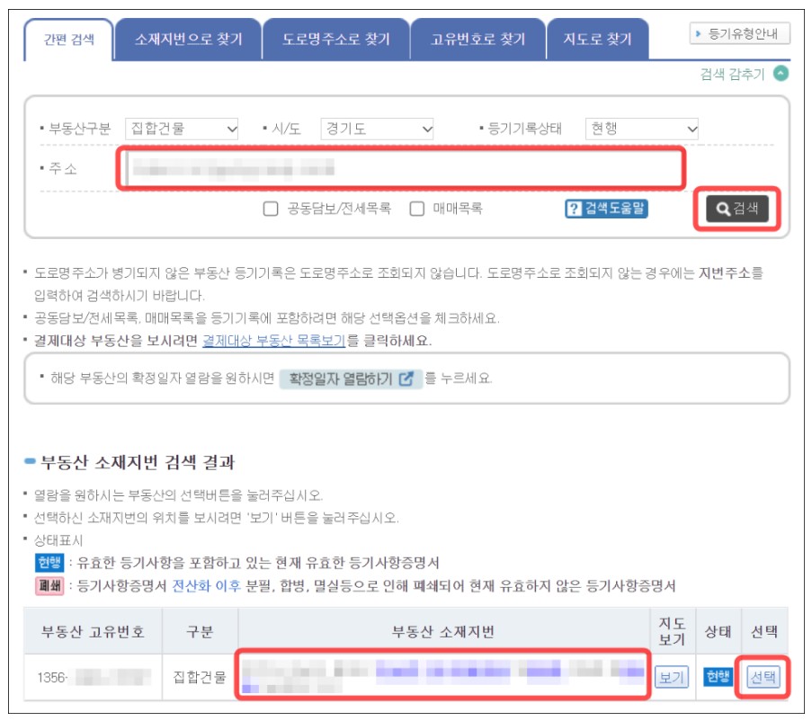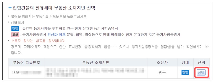검색을 하고 화면을 아래로 내리면 부동산 고유번호, 구분, 부동산 소재지번을 정보가 나오고 오른쪽 끝에 선택을 눌러주세요.