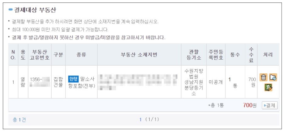 다음을 누르면 인터넷발급을 위해 여러분이 작성한 결제대상 부동산 목록이 나옵니다. 등기부등본 열람은 700원, 발급은 1,000원의 수수료가 발생합니다. 결제를 눌러주세요.