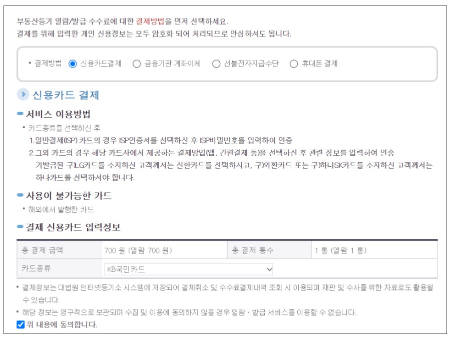 부동산 등기부등본 인터넷발급 수수료에 대한 결제방법은 신용카드결제, 금융기관, 계좌이체, 휴대폰 결제, 선불전자지급수단 중 선택하고 위 내용에 동의합니다에 체크합니다.