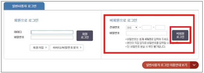 다음으로 회원으로 로그인 비회원으로 로그인 방법이 나오는데 우리는 자주 이용하지 않기 때문에 전화번호와 비밀번호 4자리를 입력하여 비회원 로그인을 합니다.