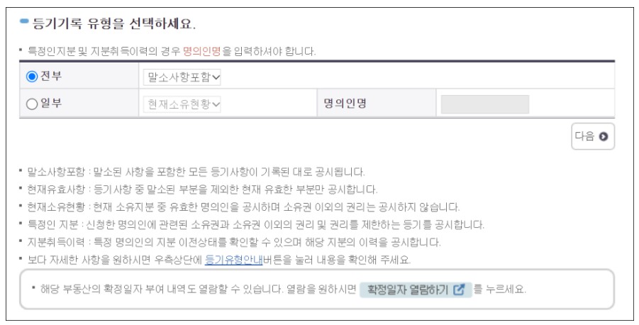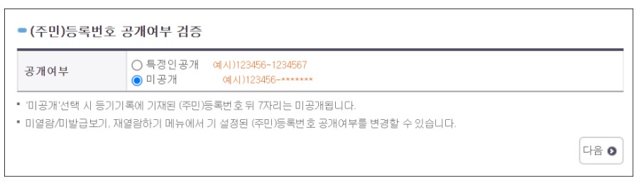 현재소유현황은 현재 소유하고 있는 명의인을 기재하고 소유권 이외의 권리는 기재하지 않습니다. 다음으로 주민등록번호 공개여부를 선택하고 다음을 눌러주세요.
