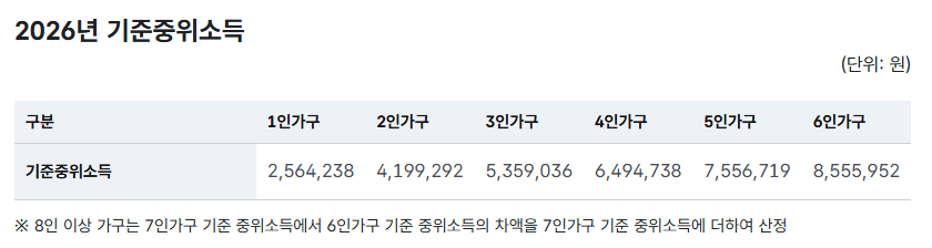 2026년 기준 생계급여는 기준 중위소득 32% 이하 가구를 대상으로 합니다. 중위소득은 매년 보건복지부에서 발표하며, 가구원 수에 따라 기준 금액이 달라집니다.