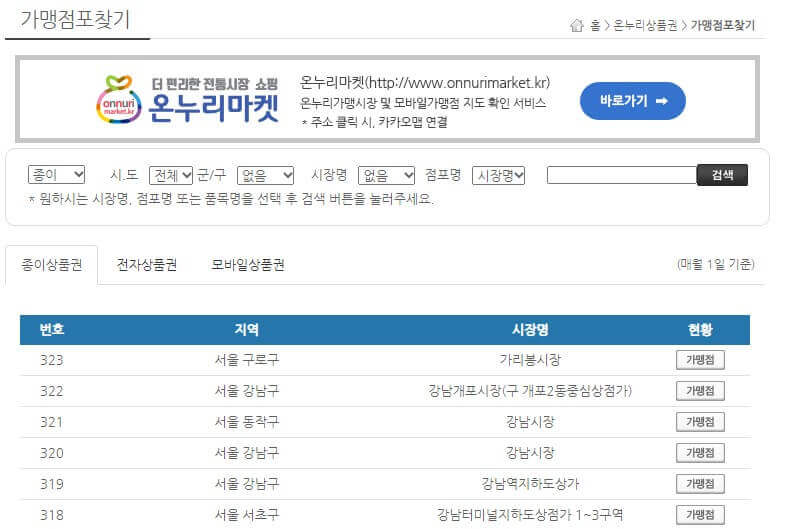 온누리 상품권은 사용 가능한 점포가 모바일, 전자, 지류별로 다르기 때문에 점포를 방문하기 전에 온누리 상품권 사용처를 사전에 확인하시는 것이 좋습니다.