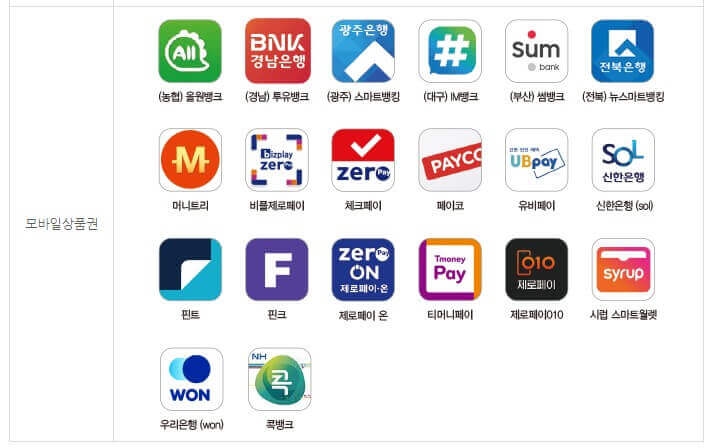 농협 올원뱅크, 신한은행, 투유 뱅크, 우리은행 원,스마트뱅킹, 핀크, 썸뱅크, 전북 뉴스마트뱅킹, 체크페이, 머니토리, 버블제로페이, 페이코, 유비페이, 핀크, 제로페이 온, 티머니페이 콕뱅크 등 총 20곳에서 모바일 상품권을 구매하실 수 있습니다.