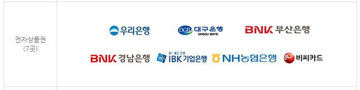 IBK기업은행, 비씨카드, NH농협은행, 우리은행, 부산은행, 대구은행, 경남은행, 등 총 7곳에서 전자 상품권을 구매하실 수 있습니다.