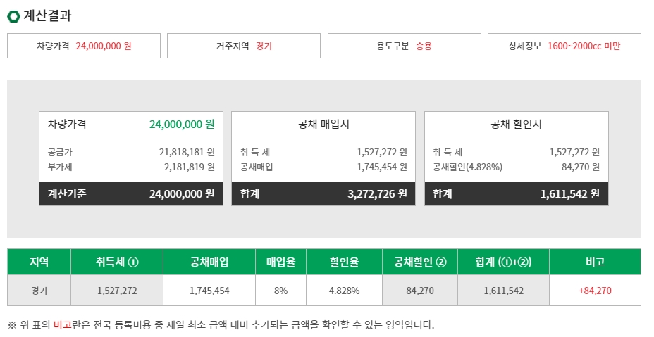차량가액을 24,000,000원으로, 거주지역을 경기로, 용도 구분을 승용으로 선택하고 상세정보에서는 1600~2000cc 미만으로 설정하여 계산한 결과, 공채 매입 시 약 3,272,726원, 공채 할인 시 약 1,611,542원의 등록비용이 나오게 됩니다.