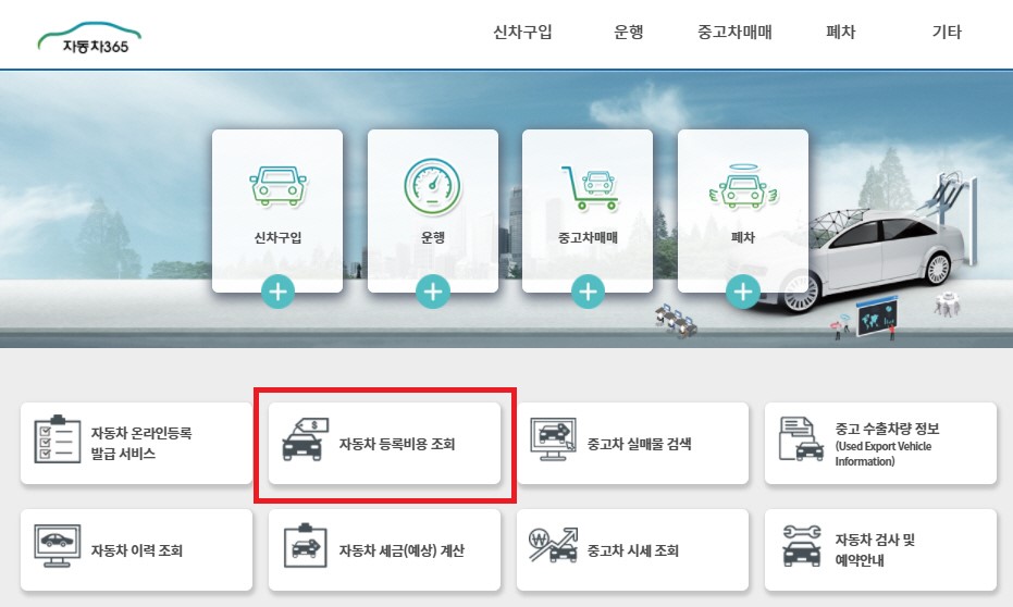 자동차 등록비용 조회를 클릭하면 자동차 취등록세 계산이 가능한 화면으로 이동합니다.
