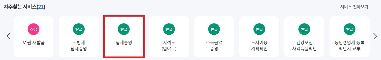정부 24 민원서비스 사이트에 들어오시면 자주 찾는 서비스 메뉴에서 납세증명을 선택합니다.