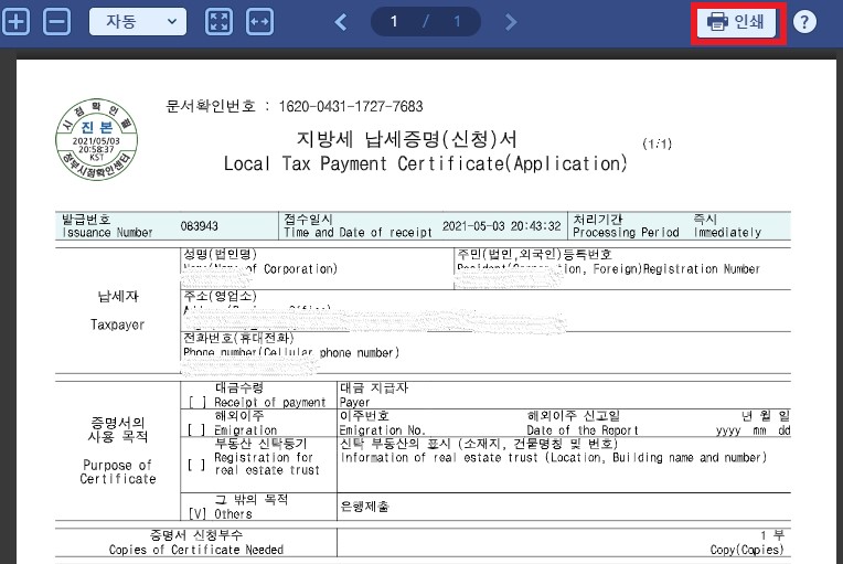 정부 24 민원서비스를 이용하는 경우 지방세완납증명서 인터넷발급뿐만 아니라 PDF파일로 저장도 가능합니다. 우측 상단에 인쇄를 눌러 컴퓨터에 연결된 프린트를 선택하면 발급이 가능하고 PDF파일로 저장을 선택하면 파일로 저장하여 나중에 발급이 가능합니다.
