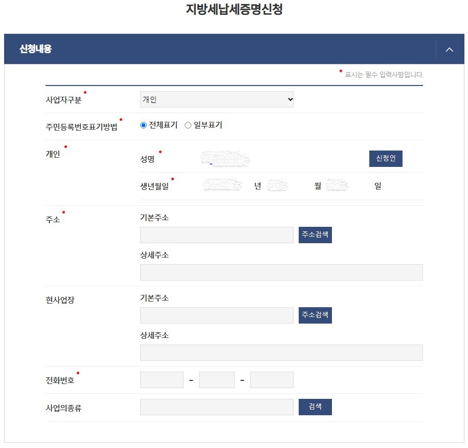 인증을 완료하면 지방세납세증명신청서 작성화면이 나오게 됩니다. 신청서에는 사업자구분, 주민등록번호표기방법, 개인, 주소, 전화번호는 필수 입력해야 합니다.