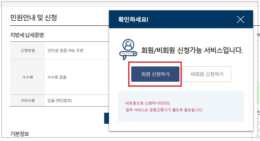지방세완납증명서 인터넷발급 민원서비스는 본인인증을 거쳐야 하기 때문에 회원 신청하기만 가능합니다. 회원 신청하기를 선택합니다.