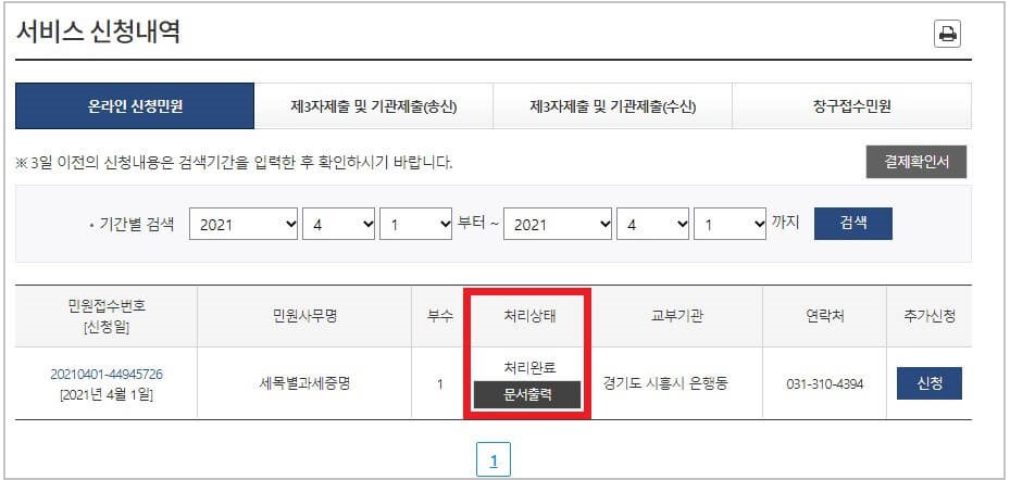 다음은 지금까지 신청한 서비스 신청내역을 확인할 수 있습니다. 문서출력을 클릭합니다.