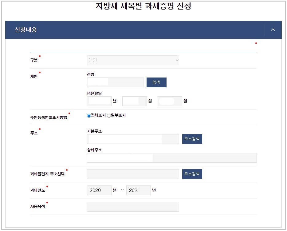 지방세 세목별 과세증명 신청서 작성은 개인, 성명, 생년월일, 주소는 자동으로 기입이 됩니다. 과세물건지 주소, 과세년도, 사용목적을 작성합니다.