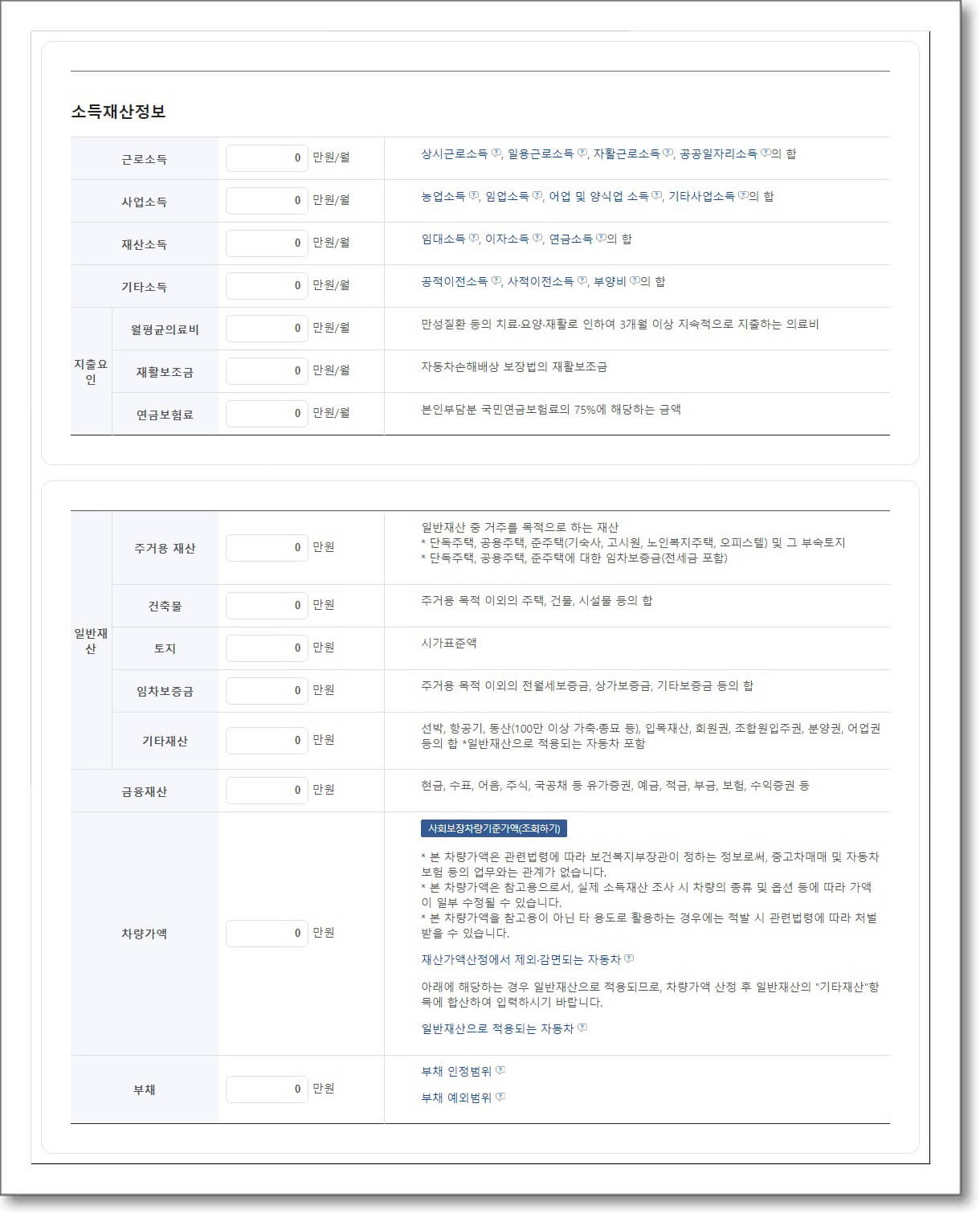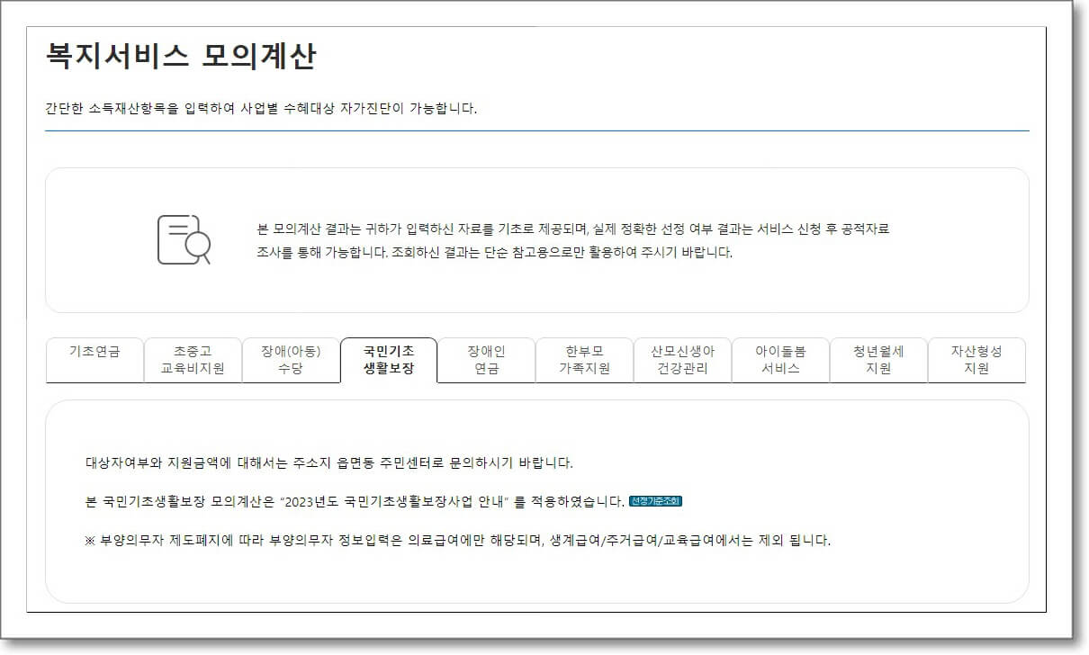 복지서비스 모의계산을 통해 본인이 차상위계층 기준에서 속하는지 확인할 수 있습니다.