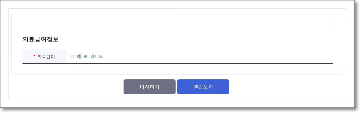 의료급여 정보를 입력하고 결과보기 버튼을 클릭하면 차상위계층 대상자 여부를 확인할 수 있습니다.