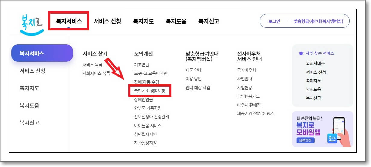먼저, 복지로 홈페이지에 접속한 다음, 상단 카테고리에서 복지서비스 위에 마우스를 올려 놓으면 모의계산 메뉴가 표시됩니다. 모의계산 메뉴에서 국민기초 생활보장을 클릭합니다.