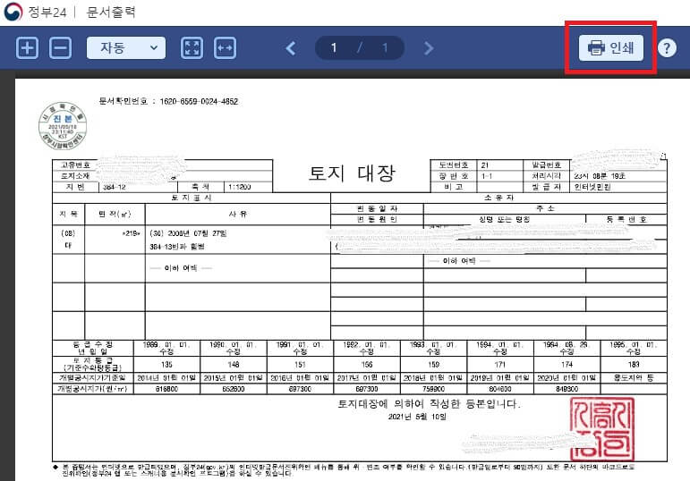 문서 출력을 선택하면 본인이 검색한 토지 대장을 확인할 수 있는 화면이 나타납니다. 인쇄하기를 선택하면 토지대장등본 인터넷발급이 완료됩니다.