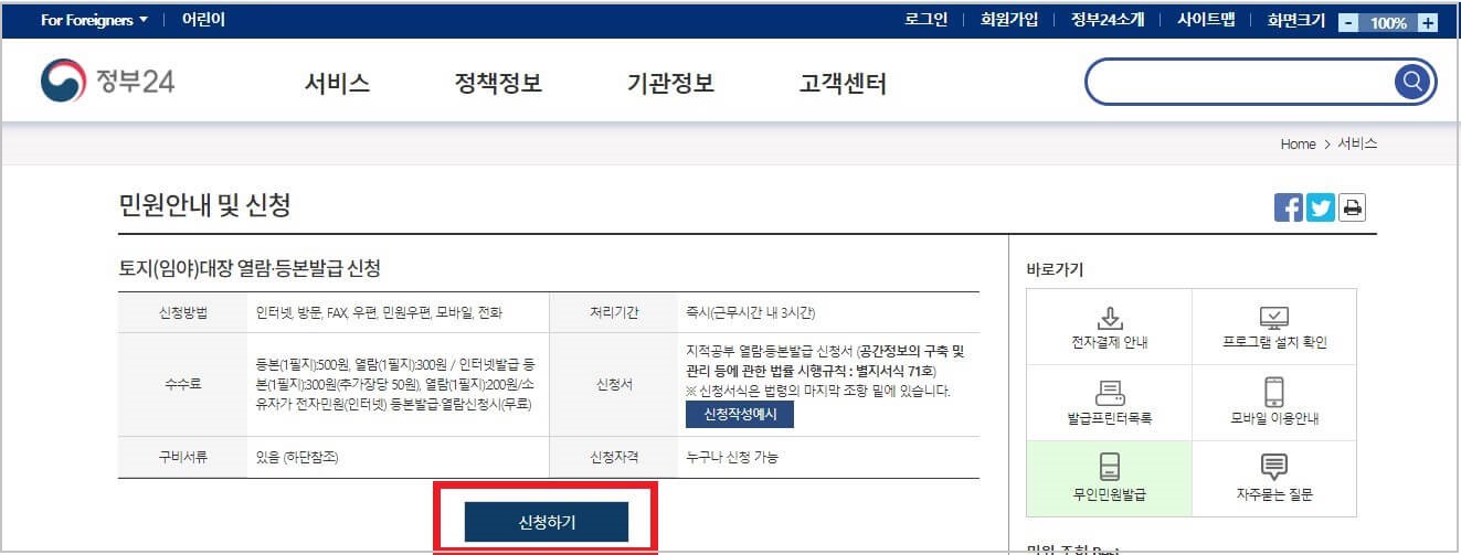 선택하면 토지(임야) 대장 열람 등본 발급 신청 페이지로 이동하게 됩니다. 인터넷을 통한 토지대장등본 발급은 수수료 없이 무료로 이용할 수 있습니다. "신청하기" 버튼을 클릭해 주세요.