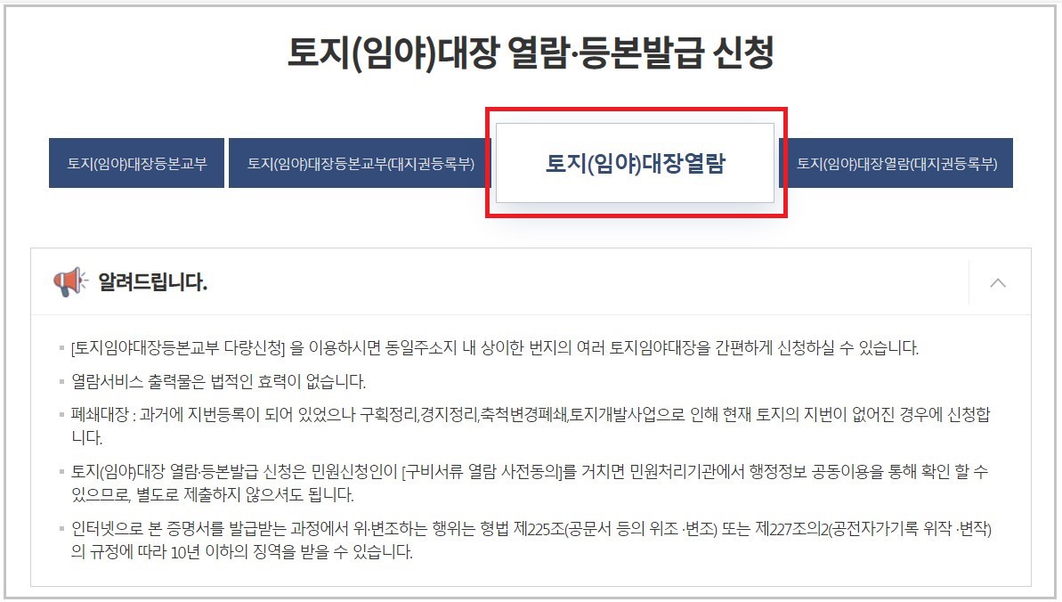 메뉴에서 토지(임야) 대장을 클릭해 주세요.