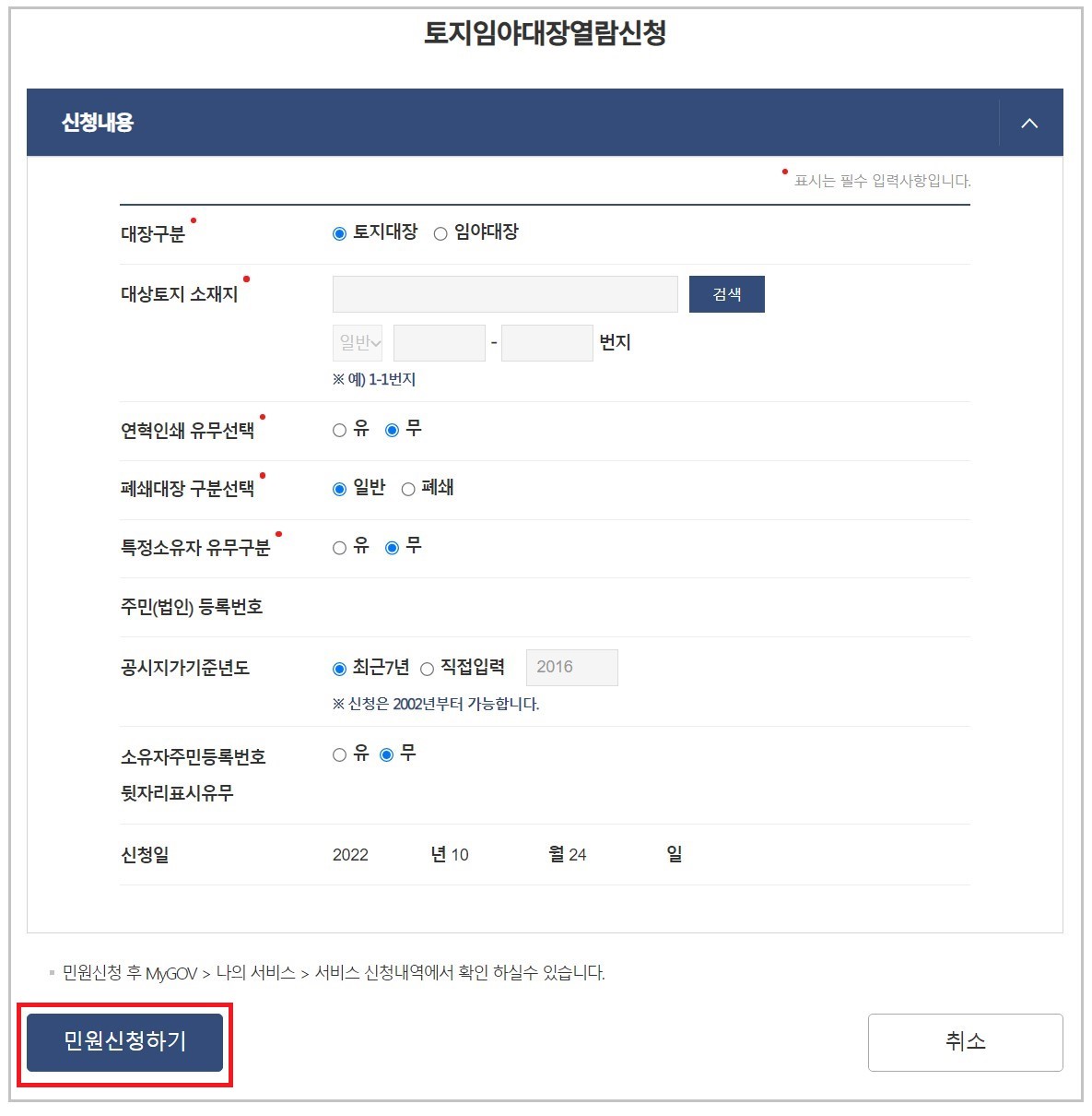 - 4. 토지(임야)대장 열람, 등본 발급 신청서 작성