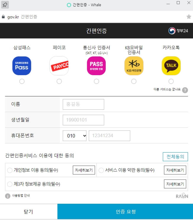 간편 인증을 누르면 정부 24 간편 인증 화면이 아래와 같이 나오게 됩니다. 여기에서 통신사 인증서를 선택하고 이름과 생년월일, 휴대폰 번호를 입력하고 전체 동의를 하고 인증 요청을 선택합니다.