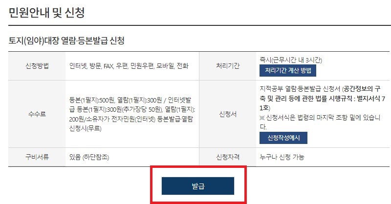 토지대장을 클릭하면 민원안내 및 신청 화면이 나옵니다. 이 페이지는 토지 또는 임야의 소재지, 토지번호, 토지구분, 면적, 소유자와 함께 토지대장 무료열람을 하거나 발급하고자 할 때 신청하는 민원입니다. 발급을 클릭해 주세요.