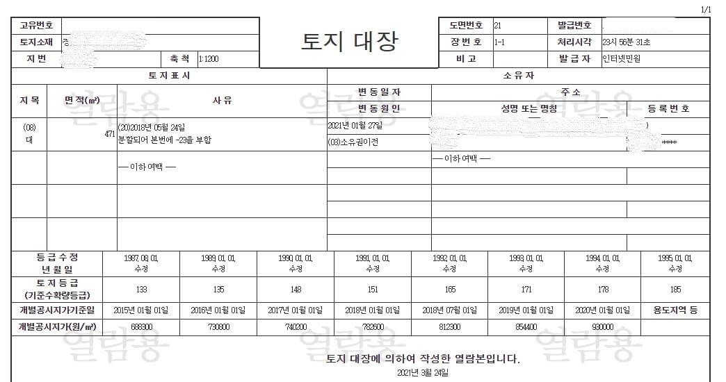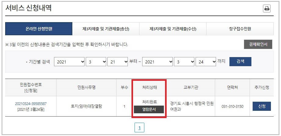 열람문서를 누르면 여러분이 신청한 토지대장을 확인할 수 있습니다.