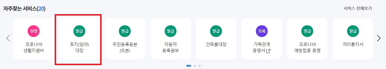 토지대장 무료열람은 정부 24 홈페이지에서 열람할 있으니 인터넷 검색차에서 정부 24를 검색하고 홈페이지에 접속해 주시기 바랍니다. 접속하면 많은 사람들이 자주 방문하는 서비스이기 때문에 화면 중앙을 보면 자주 찾는 서비스가 나오게 됩니다.