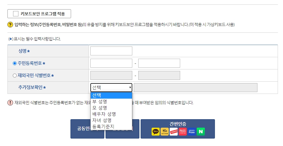 다음은 개인정보 성명, 주민등록번호, 추가정보확인은 아무나 선택을 해도 되지만 보통 배우자 성명으로 선택을 많이 합니다. 정보를 작성하고 공동/금융인증, 간편 인증 3가지 본인인증 방법 중 한 가지를 선택하여 인증절차를 마칩니다.