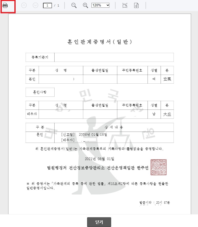 오른쪽 상단에서 프린터 모양을 클릭하여 컴퓨터에 연결되어 있는 프린터 모델을 선택하면 혼인관계증명서 인터넷발급이 완료됩니다. 만약 프린터가 없다면 PDF파일로 저장을 선택하여 저장 후 나중에 발급받을 수 있습니다.