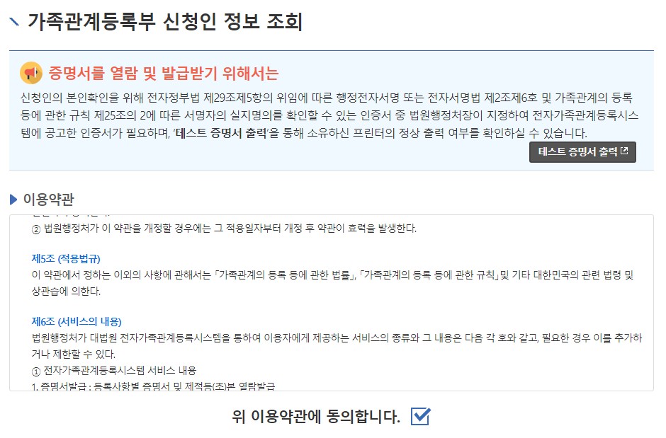 가족관계등록부 신청인 정보 조회를 위해 이용약관 동의를 해주셔야 합니다. 위 이용약관 동의에 체크를 합니다.